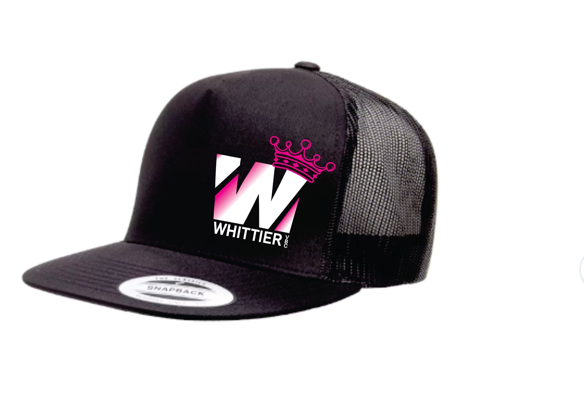 These unisex Flat Bill Hats are available in classic Black, pink, and a striking Black and white combination. This edition showcases the distinctive PINK Whittier Logo, offering a confident and refined statement.